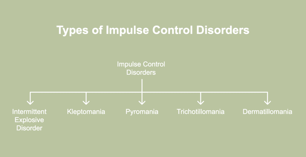 Impulse control disorders (ICDs) refer to a group of psychiatric disorders characterized by difficulty resisting urges or impulses possibly harmful to oneself or others. Types of impulse control disorder are distinct mental illnesses marked by difficulties resisting negative impulses or desires, usually leading to disruptive and repetitious behaviors. The types of impulse control disorder are listed below.