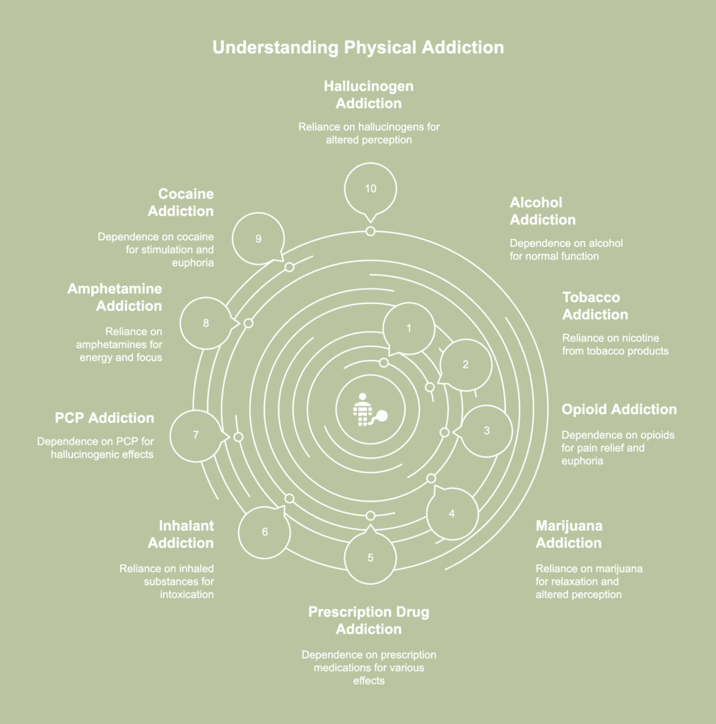 Physical addiction occurs when the body becomes so dependent on a substance to the point of experiencing withdrawal symptoms without it. The substance alters brain chemistry, creating a physical need to continue using to feel normal.