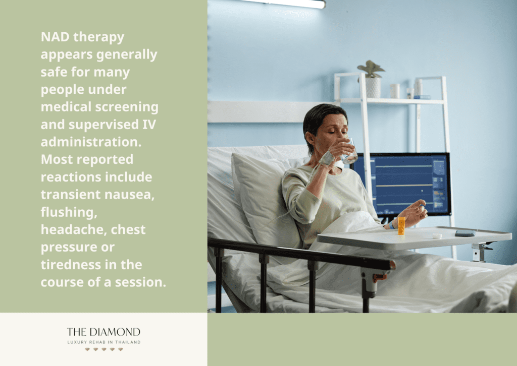 Yes, NAD therapy appears generally safe for many people under medical screening and supervised IV administration. Most reported reactions include transient nausea, flushing, headache, chest pressure or tiredness in the course of a session.