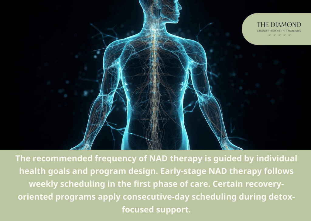 The recommended frequency of NAD therapy is guided by individual health goals and program design. Early-stage NAD therapy follows weekly scheduling in the first phase of care. Certain recovery-oriented programs apply consecutive-day scheduling during detox-focused support.