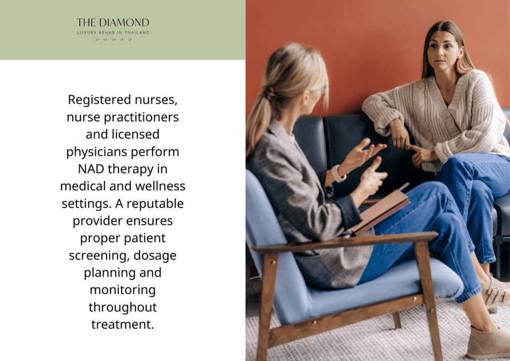 Registered nurses, nurse practitioners and licensed physicians perform NAD therapy in medical and wellness settings. A reputable provider ensures proper patient screening, dosage planning and monitoring throughout treatment.