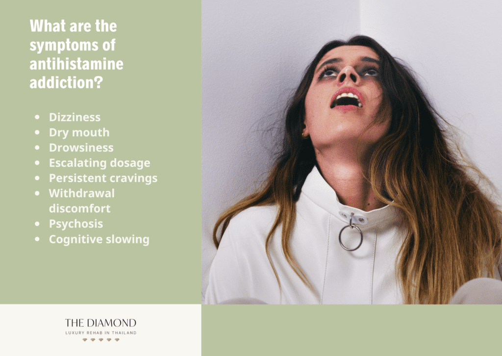 The symptoms of antihistamine addiction include dizziness, dry mouth, drowsiness, escalating dosage, persistent cravings, withdrawal discomfort, psychosis and cognitive slowing.