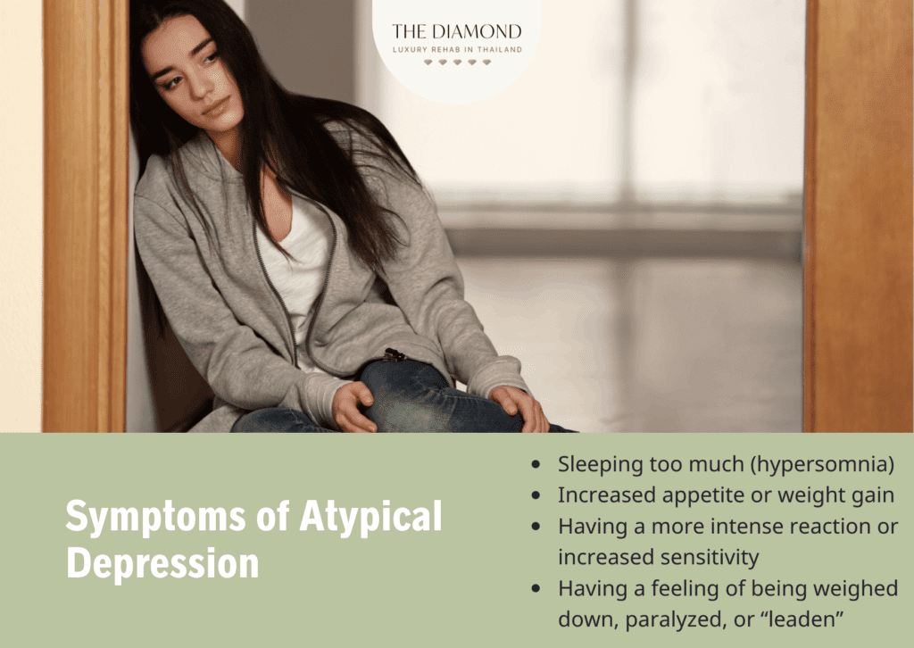 Symptoms of atypical depression include sleeping too much (hypersomnia), increased appetite or weight gain, having more intense reactions or increased sensitivity, and a feeling of being weighed down, paralyzed, or leaden.