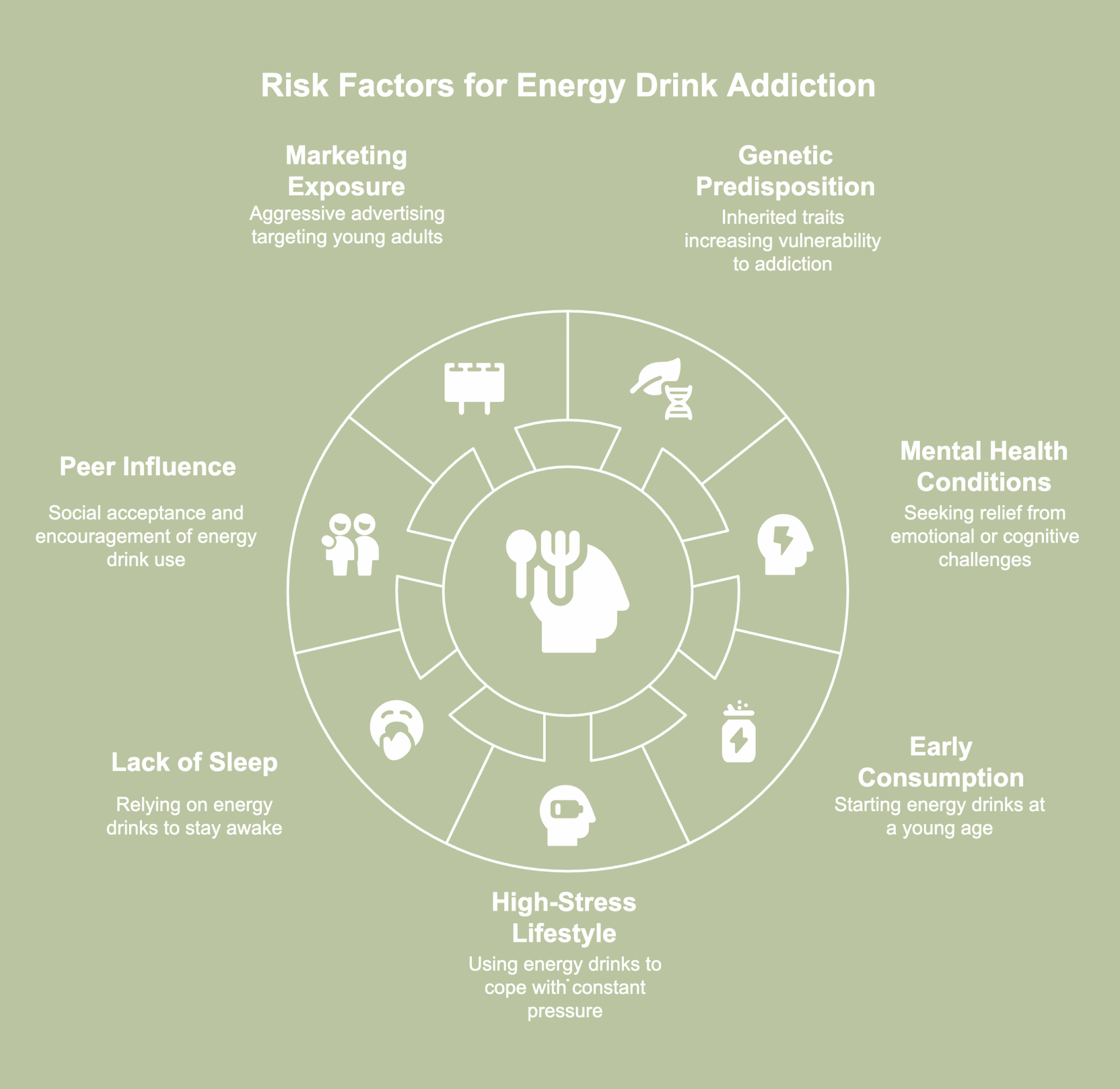 Risk factors for energy drink addiction refer to the traits or situations making someone more likely to become dependent on energy drinks. The risk factors for energy drink addiction are listed below.