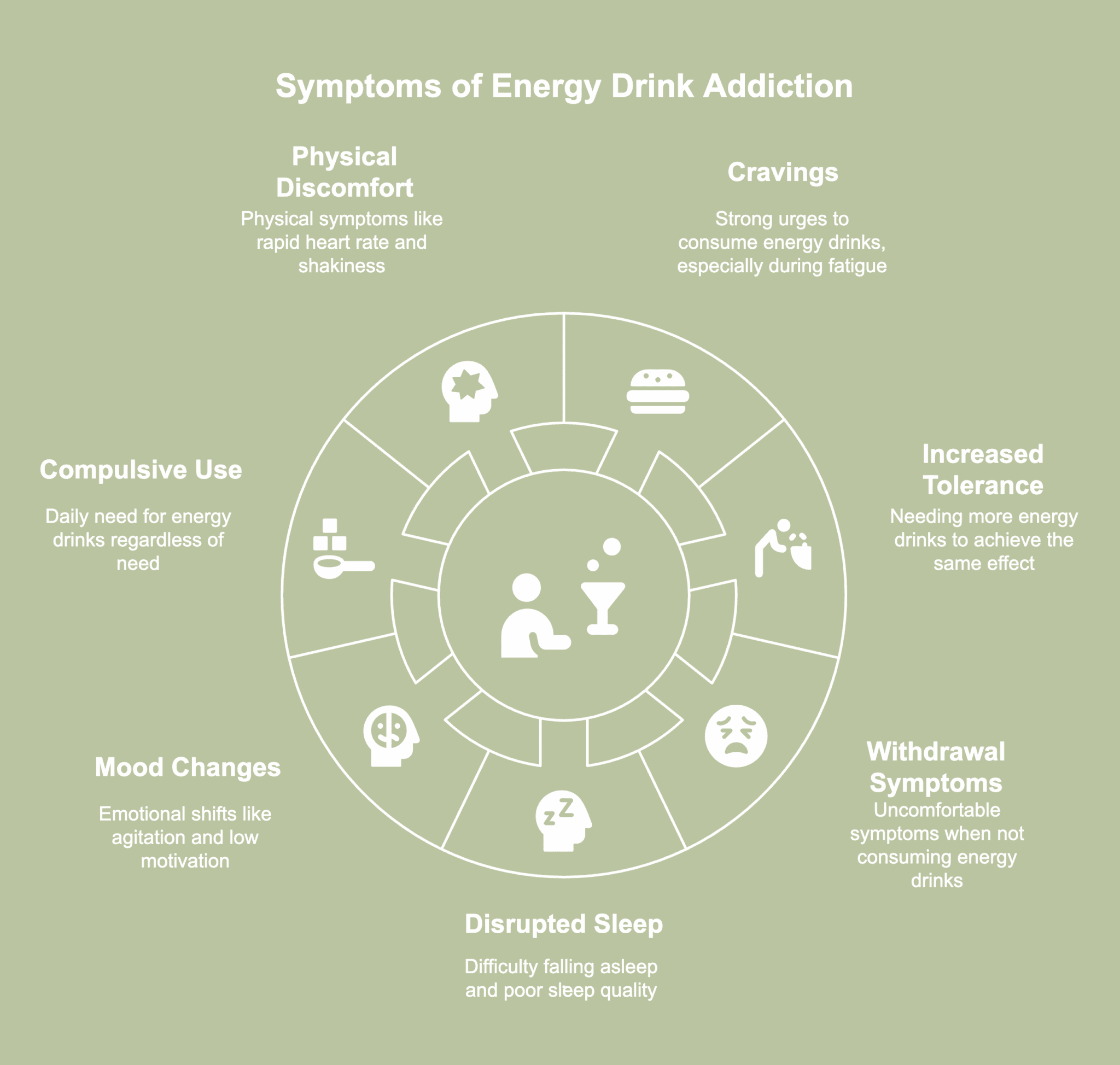 The symptoms of energy drink addiction include cravings, increased tolerance, withdrawal symptoms, disrupted sleep, mood changes, compulsive use and physical discomfort.