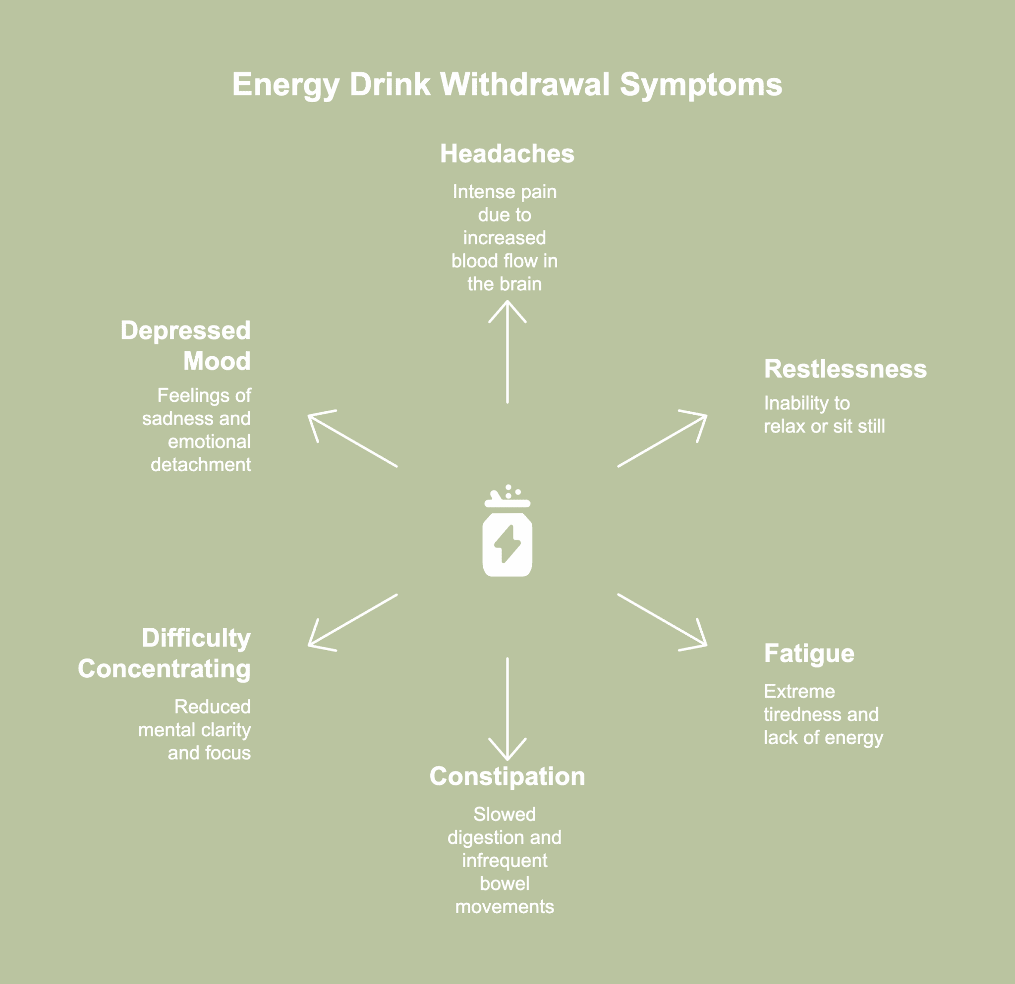The symptoms of energy drink withdrawal include headaches, restlessness, fatigue, constipation, difficulty concentrating and depressed mood.