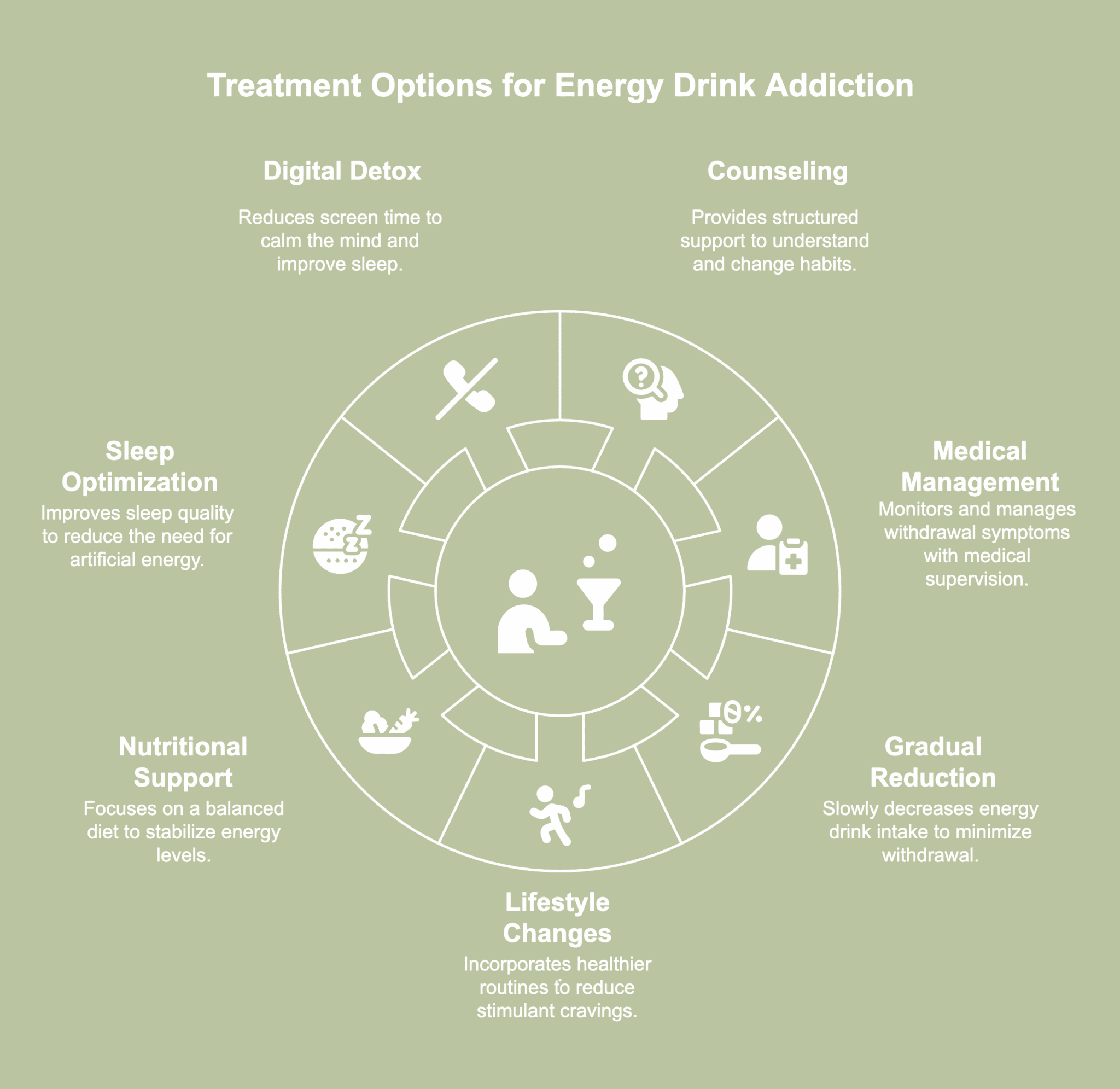 Treatment options for energy drink addiction include counseling, medical management, gradual reduction, lifestyle changes, nutritional support, sleep optimization and digital detox strategies.